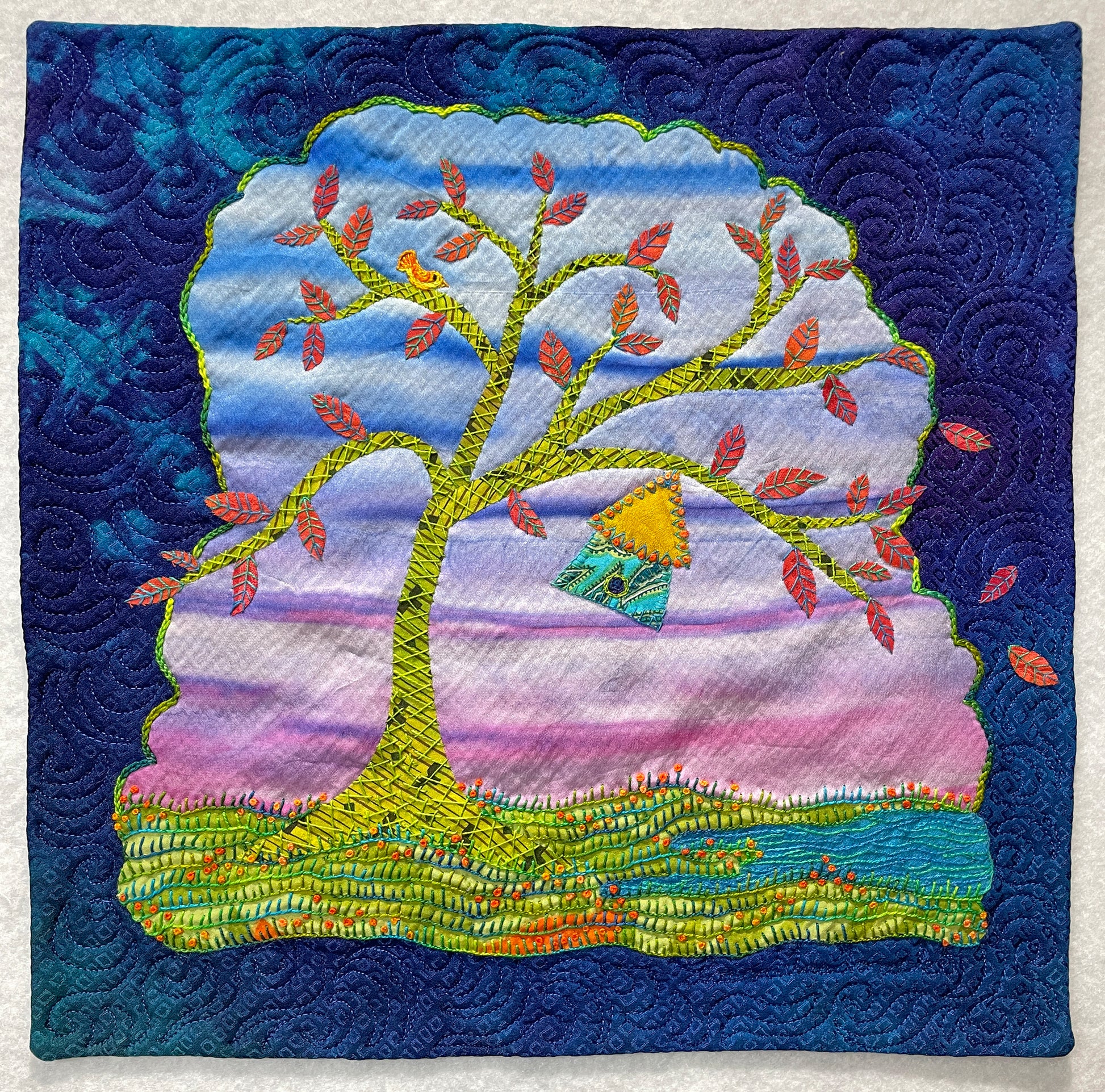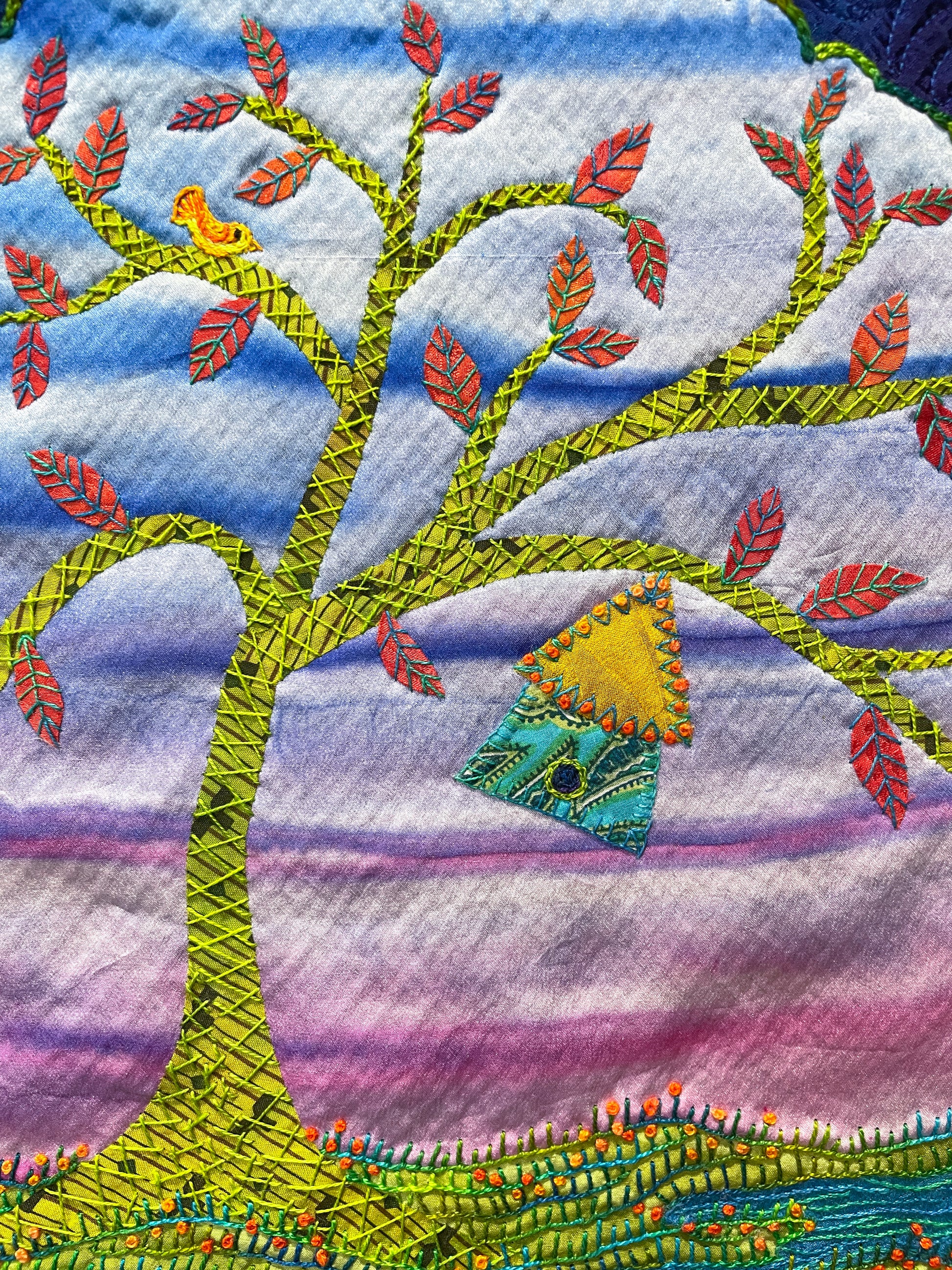 Laura Wasilowski is a textile artist and creator of hand-dyed fabrics and threads. Her pictorial art quilts and free-form embroideries are collected and exhibited internationally. Wasilowski’s art work is inspired by stories of family, friends, and home. The whimsical wall pieces, created from fused fabrics, are hand-embroidered or machine quilted. Her free-form embroideries depict everyday objects, landscapes, and personal narratives. She has an undergraduate degree in Costuming from the College of St. Benedict, St. Joseph, MN and a Master